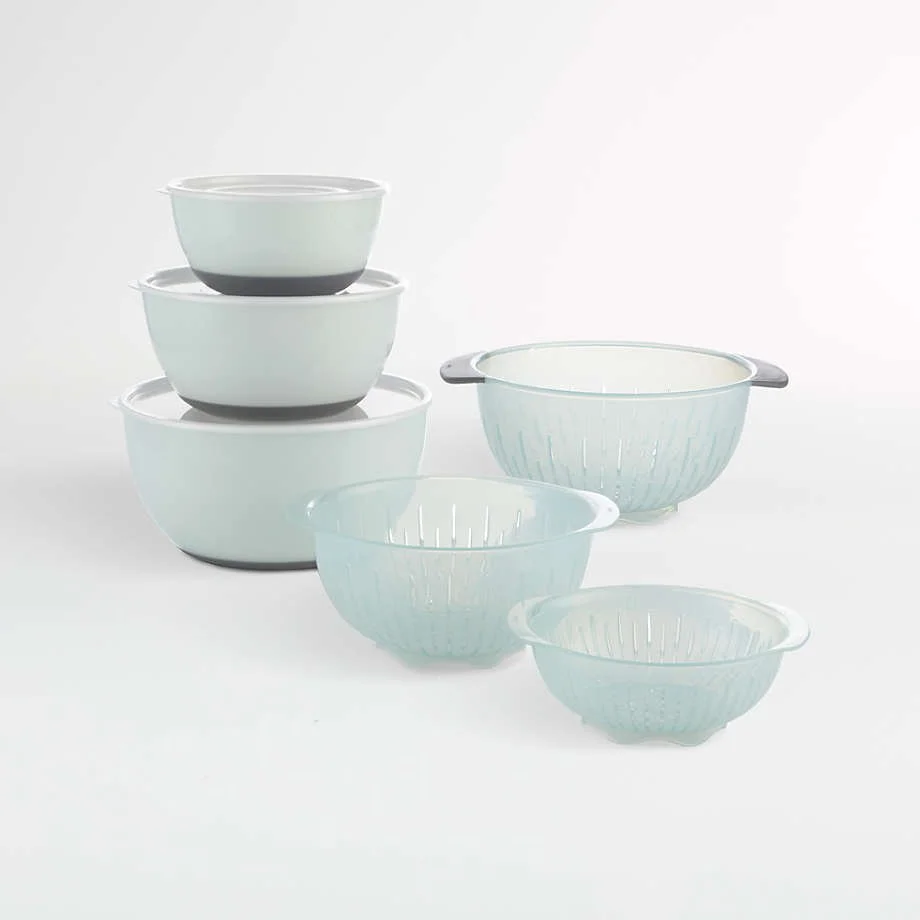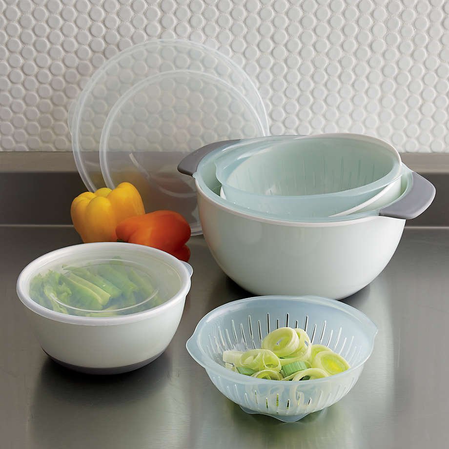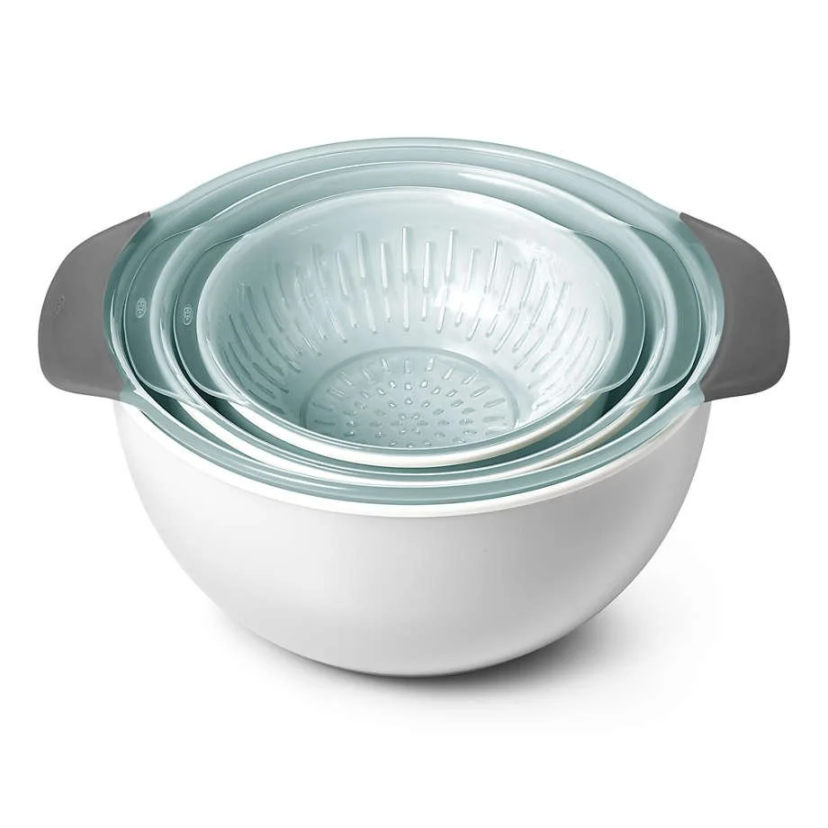 OXO GOOD GRIPS NESTING BOWLS AND COLANDERSThree mixing bowls with three sealing lids and three colanders.
